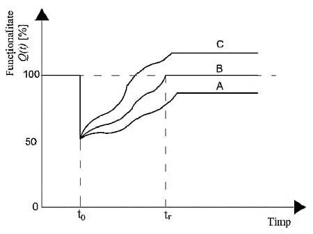 In cazul aparitiei unui cutremur, functionalitatea sistemului scade brusc la timpul t0, de la nivelul de 100% la unul inferior, cel din urma depinzand de raspunsul seismic al acestuia. Apoi, urmeaza perioada de reabilitare, de la t0 – la timpul tr,  care are ca scop atingerea starii initiale a sistemului, i.e. graficul B, sau chiar imbunatatirea ei, i.e. graficul C. In cazul in care resursele sunt limitate, iar organizarea societatii este neadecvata gestionarii eficiente a situatiei de urgenta, este posibil ca durata procesului de recuperare sa fie mai mare sau ca acesta sa se opreasca la un anumit nivel, inferior in raport cu starea de functionalitate initiala, i.e. graficul A, dar care sa fie suficient pentru o functionare satisfacatoare a socie­tatii (Bunea 2016).